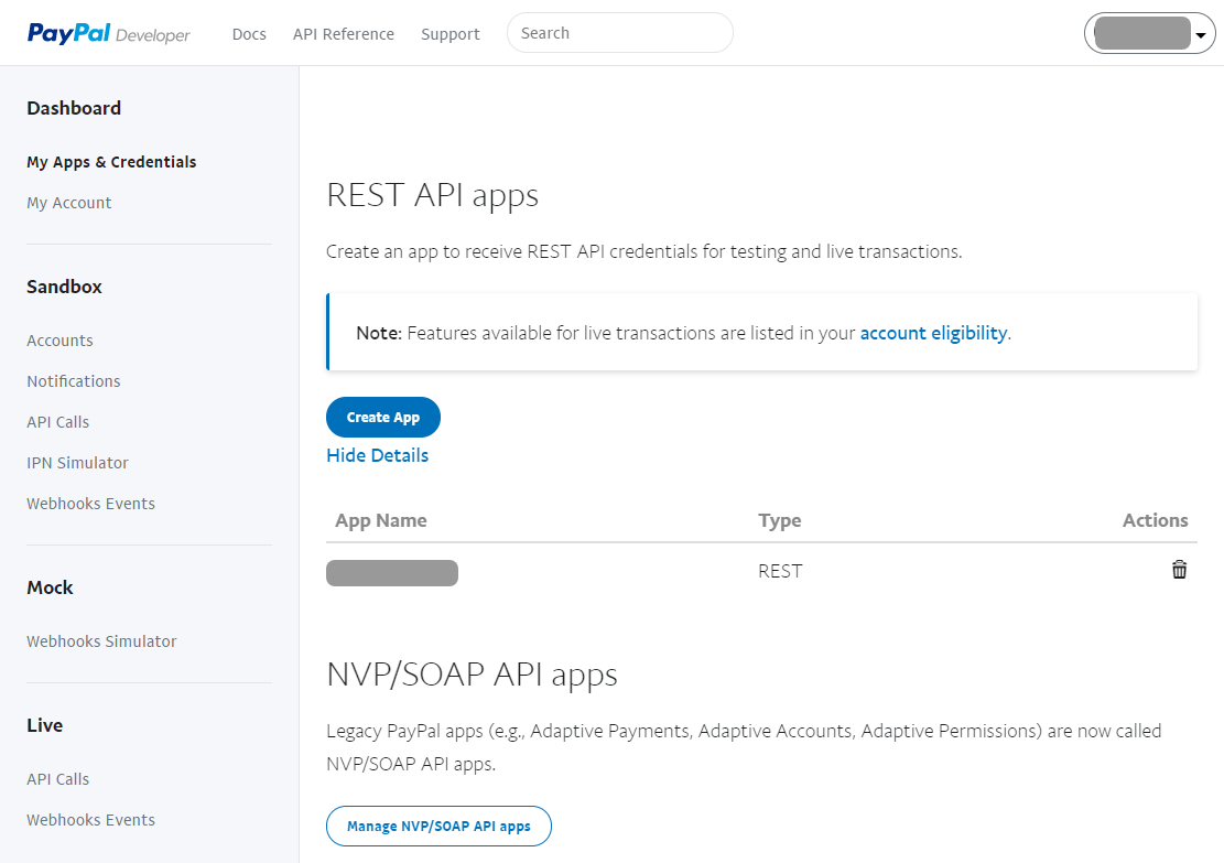 https://developer.paypal.com/developer/applications/ をご覧ください。 ログインボタンを使用してPayPalアカウントにログインします。 ログインしたら、"REST APIのアプリ "というタイトルが表示されるまで下にスクロールします。 アプリ作成」ボタンを押す アプリ名にビジネス名を入力し、サンドボックスの開発者アカウントフィールドを無視します。 アプリを作成」ボタンを押して、このステップを完了します。